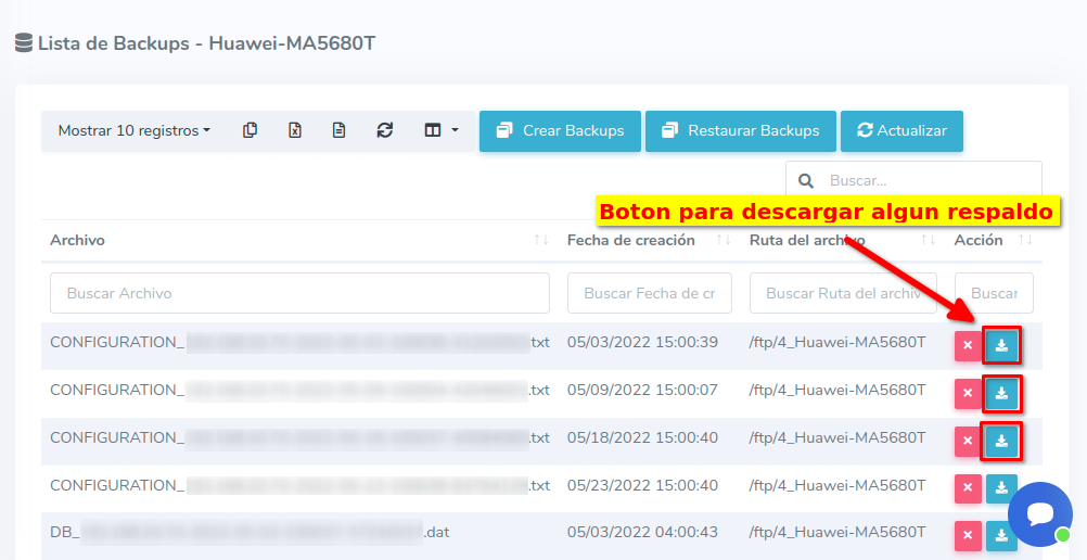 Ahora es posible descargar los backups (respaldos) listados en la tabla que está disponible en AdminOLT. Esta opción es única para OLTs marca HUAWEI y ZTE