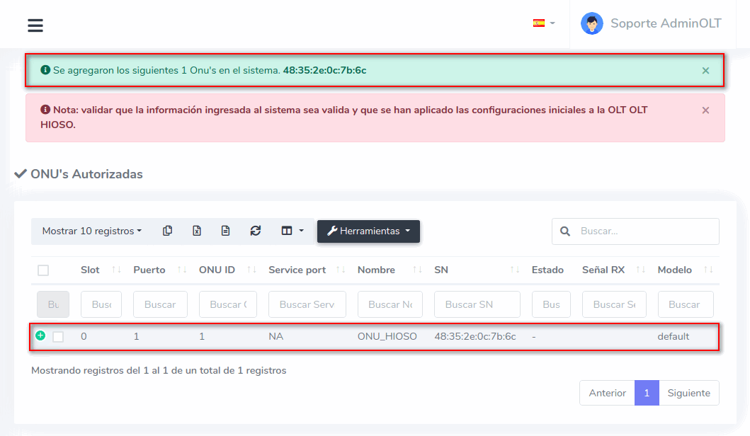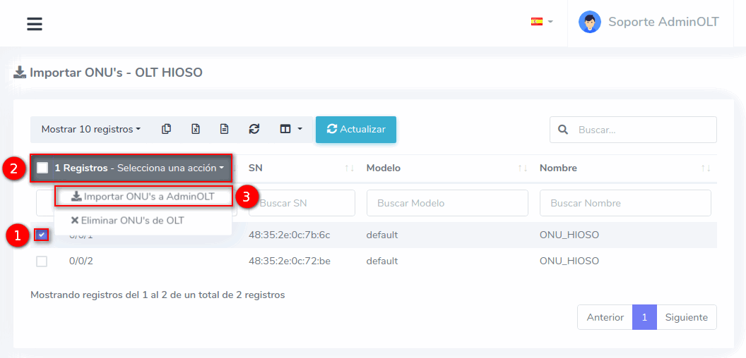 3Una vez que hayamos seleccionado los equipos, importamos las ONU's al sistema AdminOLT