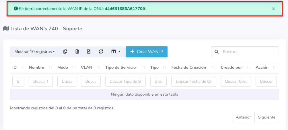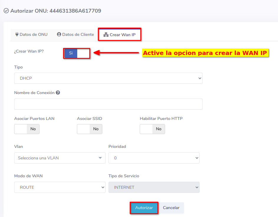 2Seleccione la opción Crear WAN IP y complete el formulario, con este proceso podrá autorizar y crear una WAN IP a una ONU al mismo tiempo.