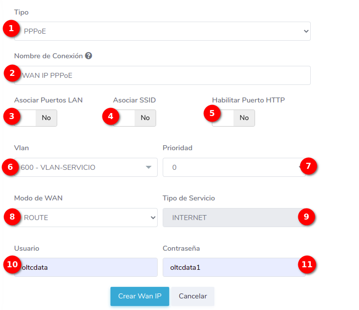 - 1.-Tipo: En AdminOLT se pueden crear configuraciones WAN IP de tipo STATIC, DHCP, PPPoE. En este ejemplo crearemos una WAN IP PPPoE.