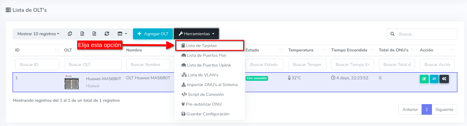 1 Ingrese al apartado de Tarjetas de su OLT en el sistema.