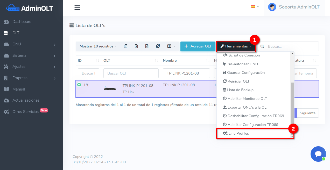 1Diríjase a la lista de OLT's y seleccioné la OLT (TP-Link) que desea configurar.