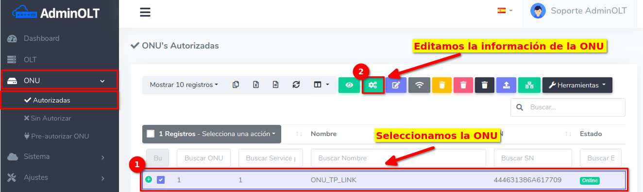 En AdminOLT podemos editar información de una ONU Autorizada en la OLT, supongamos que alguna de las ONUs que tenemos autorizadas en el sistema se estropea. Tomaremos como ejemplo esta situación para explicar el propósito de esta función. Así que en ese caso en AdminOLT al editar ONU por SN podemos tomar información de alguna ONU no Autorizada y usarla, sin perder la configuración inicial que teníamos.