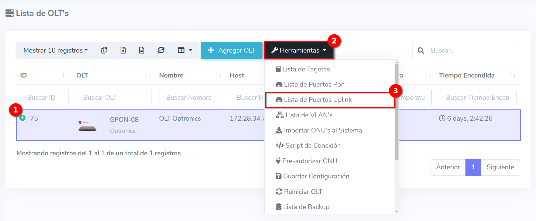 1 En la Lista OLT's seleccionamos el equipo con el que trabajaremos para después ir a Puertos Uplink, que se encuentra en el botón con la leyenda Herramientas.