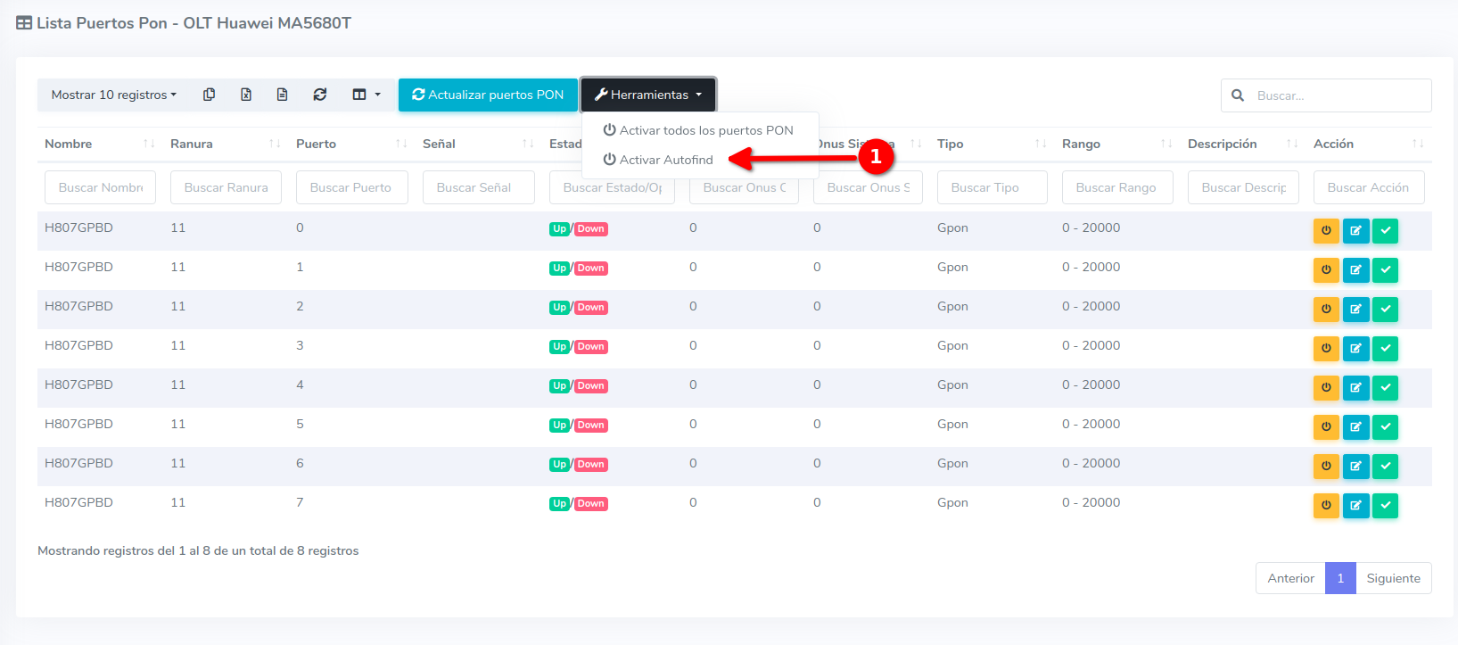3Una vez que se termine el proceso podremos ver en la vista la lista de puertos disponibles en nuestra OLT.