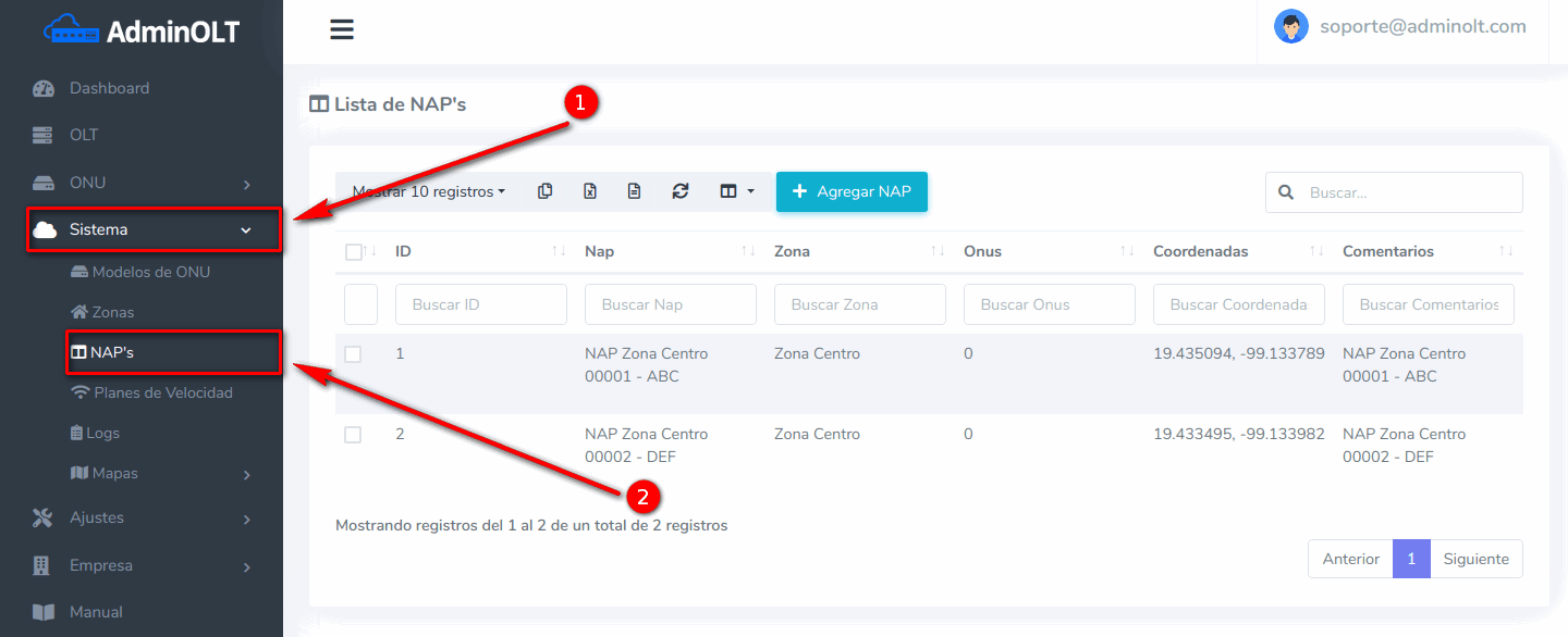 1 Ir a la sección Sistema > NAP’s > Lista de NAP’s