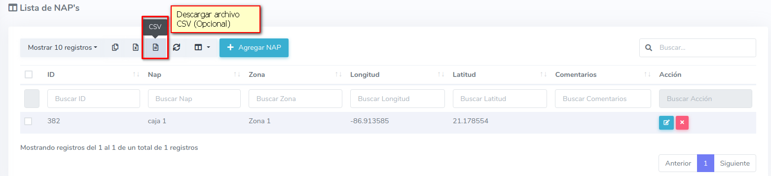 Esta opción permite importar Naps desde un archivo CSV (Valores separados por comas) con las siguientes columnas.