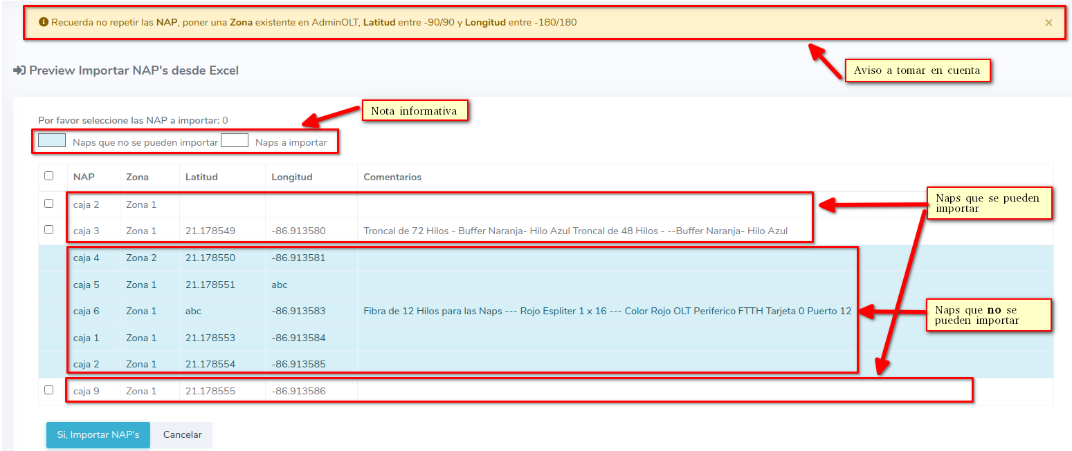 3A continuación un previo de los datos, en el cual mostrará un aviso a tomar en cuenta, también se le mostrará todas las Naps que están en el archivo y se le indicará cuáles Naps se pueden importar y cuáles no debido a un dato erróneo que tenga.