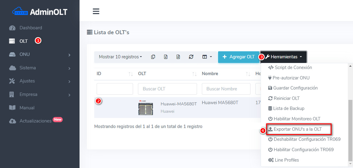 En AdminOLT se cuenta con el apartado de “Exportar ONU´s a la OLT” donde se enlistan las onus que no se encuentran en la OLT, solo en el sistema; así se agregarán las onus y tendrán el servicio.