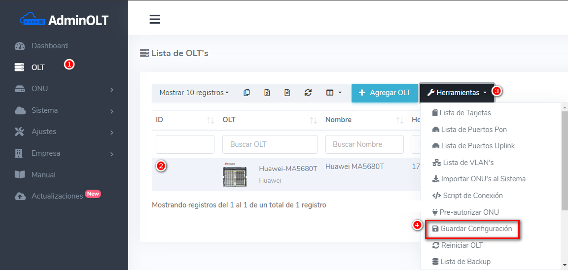 Una de las formas de mitigar este problema es guardando la configuración de su OLT periódicamente, puede realizarlo desde AdminOLT con la función de “Guardar Configuración” y con se asegurará de que los cambios sean guardados.