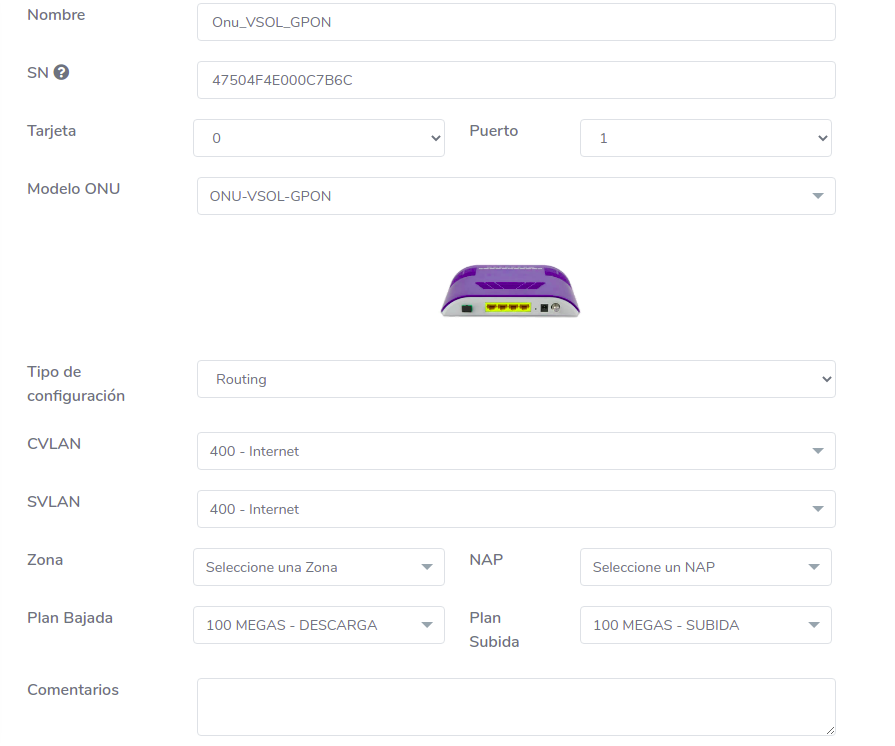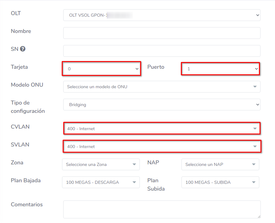 Es necesario que como primer paso sea seleccionar la OLT donde se realizara la acción. Al momento de seleccionar alguna OLT, se autocompletaran algunos datos del formulario, por ejemplo Tarjetas, Puertos o VLAN.