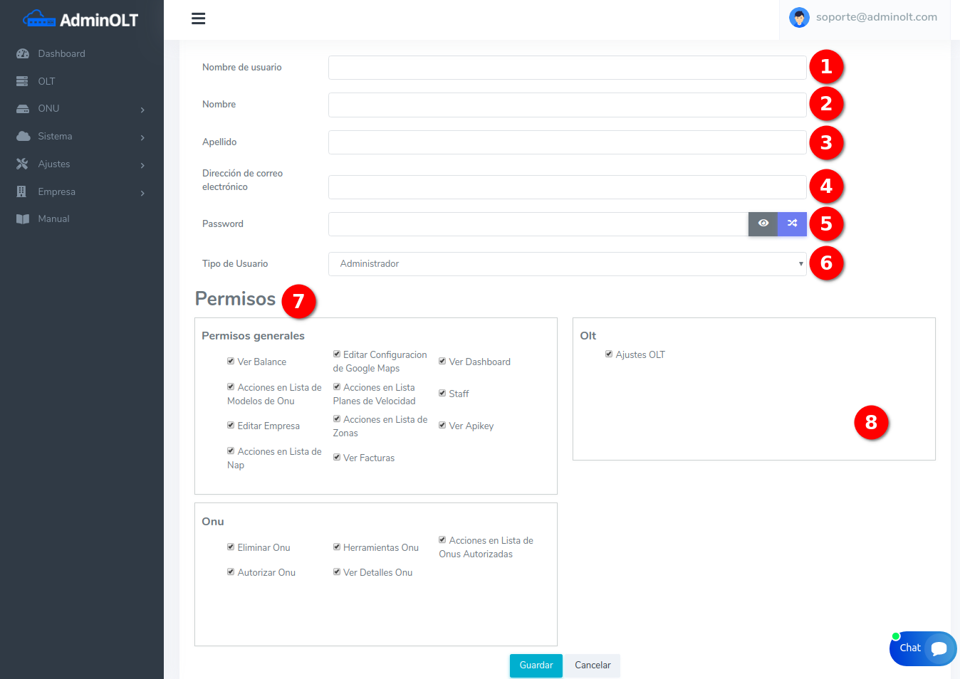 Técnico: Los usuarios con este rol pueden agregar o editar elementos clave del sistema, como OLTs, ONUs, Zonas, NAP, Planes de Velocidad y Google Maps. Además, tienen la capacidad de ver la clave API (Api Key), pero no pueden realizar cambios críticos que afecten la administración general.